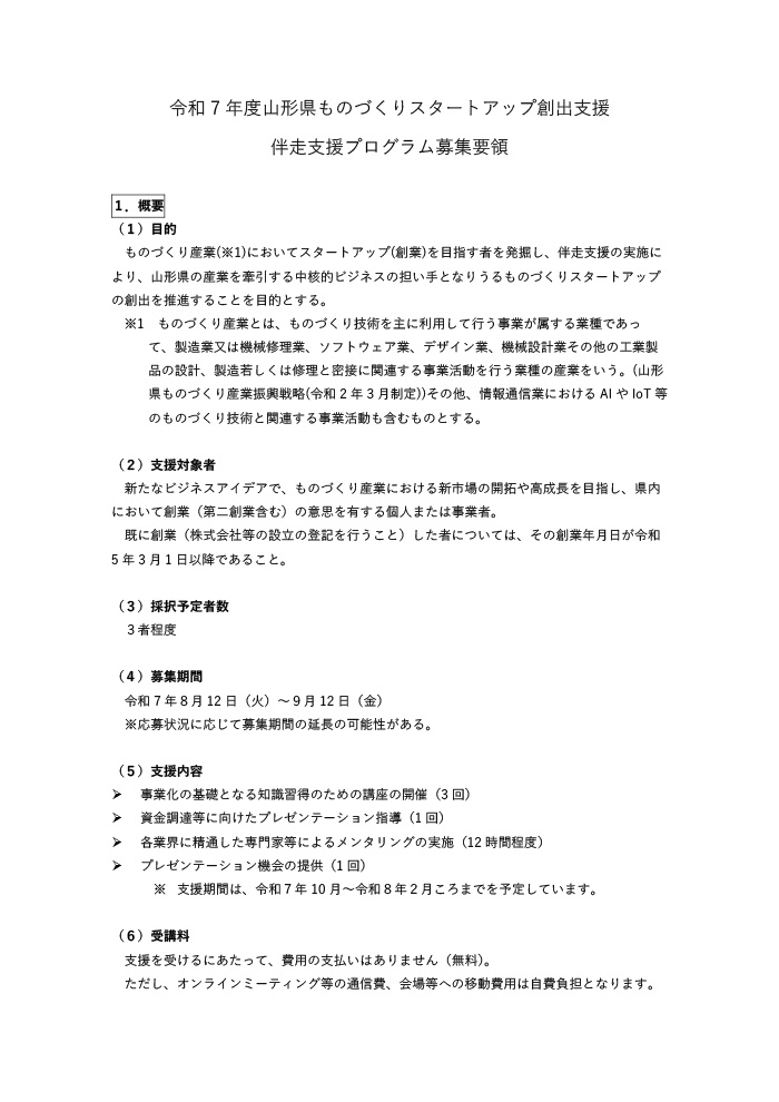 ものづくり産業(※1)においてスタートアップ(創業)を目指す者を発掘し、伴走支援の実施により、山形県の産業を牽引する中核的ビジネスの担い手となりうるものづくりスタートアップの創出を推進することを目的とする。
